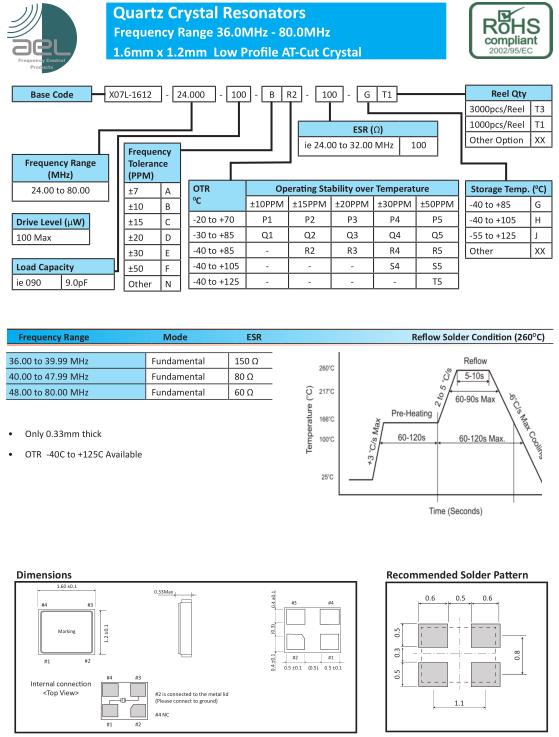 | AEL晶振規格 | 單位 | X07L-1612晶振頻率范圍 | 石英晶振基本條件 | |