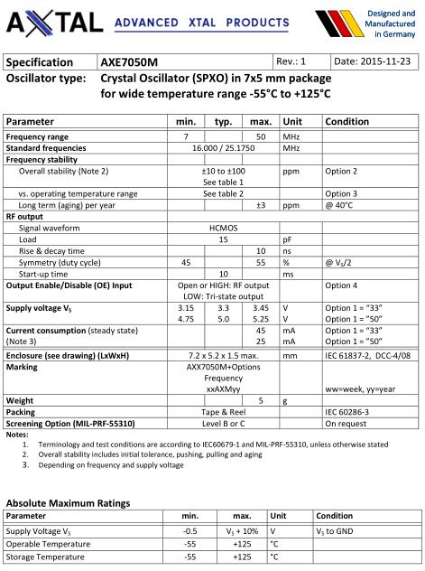 AXTAL晶振,AXE7050M晶振,AXE7050M-50-25-2C_Rev.1-10.000MHz晶振,小型SMD有源晶振,從最初超大體積到現在的7050mm,6035mm,5032mm,3225mm,2520mm體積,有著翻天覆地的改變,體積的變小也使產品帶來了更高的穩定性能,接縫密封石英晶體振蕩器,精度高,覆蓋頻率范圍寬的特點,SMD高速自動安裝和高溫回流焊設計,Optionable待機輸出三態輸出功能,電源電壓范圍:1.8V~5V,高穩定性,低抖動,低功耗,主要應用領域:無線通訊,高端智能手機,平板筆記本WLAN,藍牙,數碼相機,DSL和其他IT產品的晶振應用,三態功能,PC和LCDM等高端數碼領域,符合RoHS/無鉛.