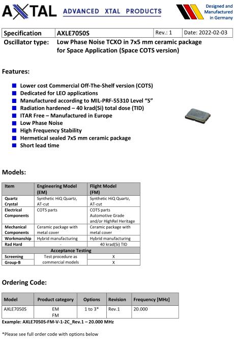 AXTAL晶振,AXLE7050S晶振,AXLE7050S-FM-V-1-2C_Rev.1-20.000MHz晶振