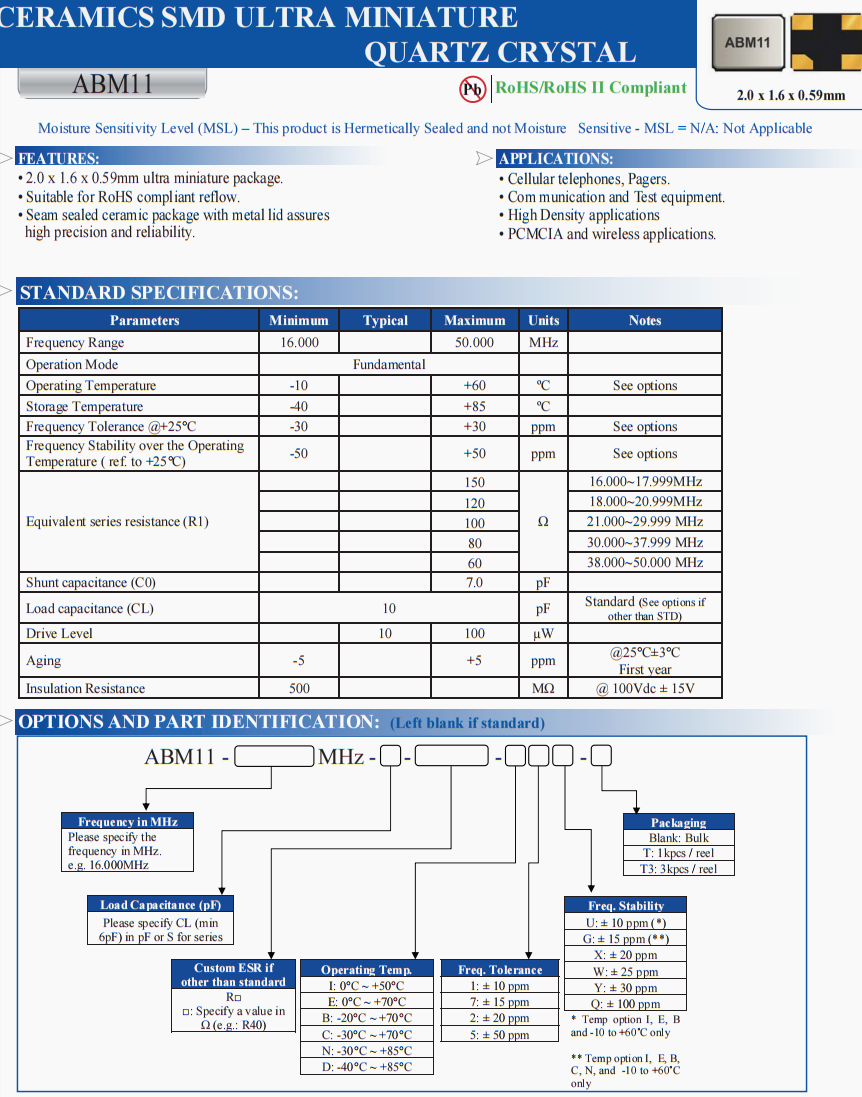 | ABM11-16.000MHZ-D2X-T | Abracon | ABM11 | 16 MHz | ±20ppm | ±20ppm | 10 pF |