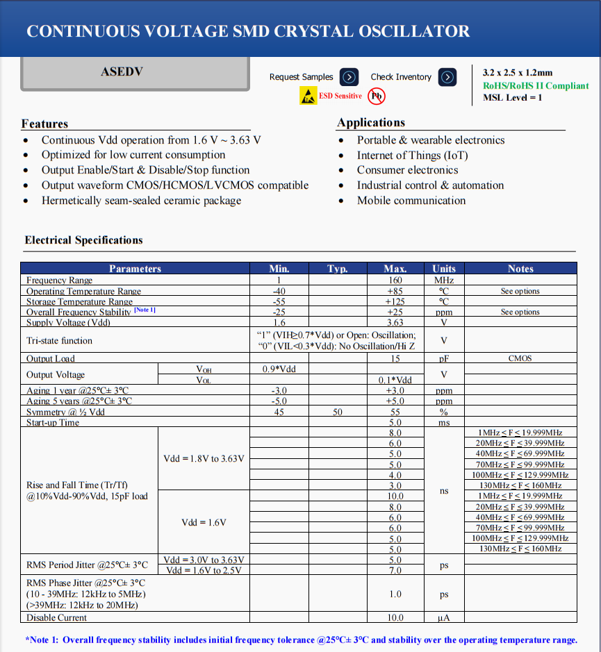 | ASEDV-32.000MHZ-LC-T3 | Abracon晶振 | ASEDV | XO | 32 MHz | 1.8V ~ 3.3V | ±50ppm |