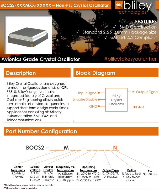 Bliley晶振,BOCS2晶振,BOCS2-12.000MBE-DDYT晶振,小型SMD有源晶振,從最初超大體積到現在的7050mm,6035mm,5032mm,3225mm,2520mm體積,有著翻天覆地的改變,體積的變小也使產品帶來了更高的穩定性能,接縫密封石英晶體振蕩器,精度高,覆蓋頻率范圍寬的特點,SMD高速自動安裝和高溫回流焊設計,Optionable待機輸出三態輸出功能,電源電壓范圍:1.8V~5V,高穩定性,低抖動,低功耗,主要應用領域:無線通訊,高端智能手機,平板筆記本WLAN,藍牙,數碼相機,DSL和其他IT產品的晶振應用,三態功能,PC和LCDM等高端數碼領域,符合RoHS/無鉛.Bliley Technologies Inc. 最初于 1930 年作為 Bliley Piezo-Electric Company 成立。最初,我們為業余無線電市場制造石英晶體。在 1930 年代中期,我們的客戶和產品很快擴大到與新興的軍事和商業通信領域的利益相匹配,我們的名稱更名為 Bliley Electric Company。1939 年,我們是最大的水晶公司,擁有 11 名員工。