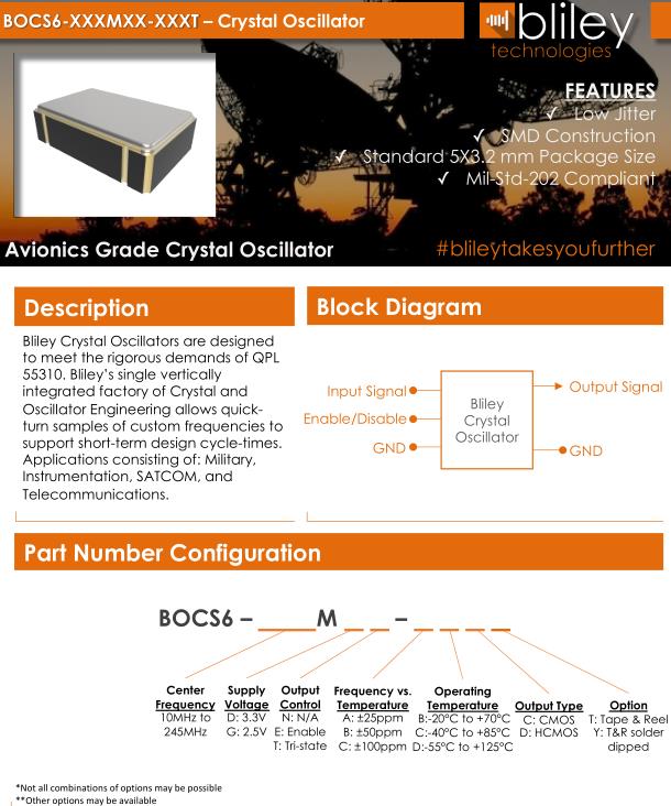 Bliley晶振,BOCS6晶振,BOCS6-26.000MDE-BBCT晶振,5032mm體積的石英晶體振蕩器,有源晶振,該產品可驅動2.5V的溫補晶振,壓控晶振,VC-TCXO晶體振蕩器產品,電源電壓的低電耗型,編帶包裝方式,可對應自動高速貼片機自動焊接,及IR回流焊接(無鉛對應),為無鉛產品,超小型,質地輕.產品被廣泛應用到集成電路,程控交換系統,無線發射基站.Bliley Technologies Inc. 最初于 1930 年作為 Bliley Piezo-Electric Company 成立。最初,我們為業余無線電市場制造石英晶體。在 1930 年代中期,我們的客戶和產品很快擴大到與新興的軍事和商業通信領域的利益相匹配,我們的名稱更名為 Bliley Electric Company。1939 年,我們是最大的水晶公司,擁有 11 名員工。