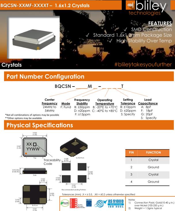 Bliley晶振,BQCSN晶振,BQCSN-24.000M-FFCDST晶振,貼片晶振本身體積小,超薄型石英晶體振蕩器,特別適用于有目前高速發(fā)展的高端電子數(shù)碼產品,因為晶振本身小型化需求的市場領域,小型,薄型是對應陶瓷振蕩器(偏差大)和普通的石英晶體振蕩器(偏差小)的中間領域的一種性價比較出色的產品.產品廣泛用于筆記本電腦,無線電話,衛(wèi)星導航SSD,USB,Blu-ray等用途,符合無鉛焊接的高溫回流焊曲線特性.Bliley Technologies Inc. 最初于 1930 年作為 Bliley Piezo-Electric Company 成立。最初,我們?yōu)闃I(yè)余無線電市場制造石英晶體。在 1930 年代中期,我們的客戶和產品很快擴大到與新興的軍事和商業(yè)通信領域的利益相匹配,我們的名稱更名為 Bliley Electric Company。1939 年,我們是最大的水晶公司,擁有 11 名員工。
