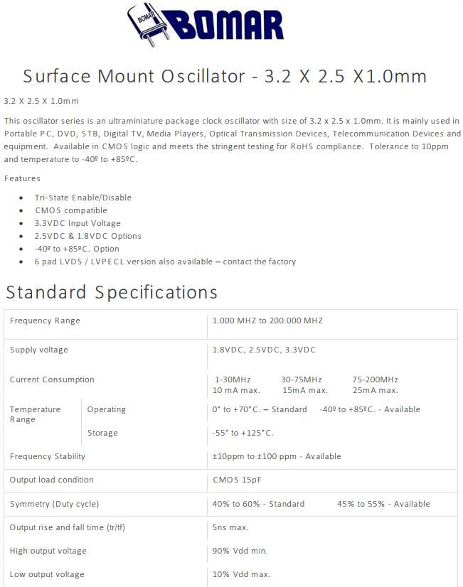 Bomar晶振,B1325-AABS3T-10.000000晶振,SMD晶體振蕩器,小型SMD有源晶振,從最初超大體積到現(xiàn)在的7050mm,6035mm,5032mm,3225mm,2520mm體積,有著翻天覆地的改變,體積的變小也使產(chǎn)品帶來了更高的穩(wěn)定性能,接縫密封石英晶體振蕩器,精度高,覆蓋頻率范圍寬的特點(diǎn),SMD高速自動(dòng)安裝和高溫回流焊設(shè)計(jì),Optionable待機(jī)輸出三態(tài)輸出功能,電源電壓范圍:1.8V~5V,高穩(wěn)定性,低抖動(dòng),低功耗,主要應(yīng)用領(lǐng)域:無線通訊,高端智能手機(jī),平板筆記本W(wǎng)LAN,藍(lán)牙,數(shù)碼相機(jī),DSL和其他IT產(chǎn)品的晶振應(yīng)用,三態(tài)功能,PC和LCDM等高端數(shù)碼領(lǐng)域,符合RoHS/無鉛.Bomar 成立于 1963 年,是一家為商業(yè)和雙向無線電行業(yè)生產(chǎn)石英晶體的制造商。該業(yè)務(wù)的性質(zhì)要求在寬頻率范圍內(nèi)具有嚴(yán)格的容差和高穩(wěn)定性晶體,以滿足嚴(yán)格的 FCC 規(guī)范。快速生產(chǎn)的需求對我們不斷增長的客戶群很重要。我們的許多客戶都是當(dāng)?shù)亍⒅莺吐?lián)邦警察和監(jiān)視機(jī)構(gòu)。Bomar 很快不僅成為該市場的領(lǐng)先供應(yīng)商,而且因其產(chǎn)品質(zhì)量、快速周轉(zhuǎn)時(shí)間和無與倫比的客戶服務(wù)而獲得一致認(rèn)可。