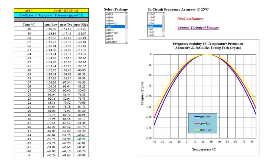 雖然可以使用數(shù)據(jù)表參數(shù)估算任何音叉晶體的溫度漂移頻率,但這種獨(dú)特的工具可快速估算給定晶體系列的最小,最大和典型漂移.易于使用,選擇晶體系列和所需的偏移是確定晶體中心頻率所必需的.