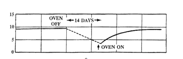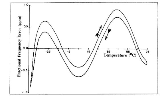 烤箱控制OCXO晶體振蕩器(OCXO)回歸示例.顯示在14天關(guān)閉后重新啟動(dòng)振蕩器時(shí),頻率比關(guān)閉前的頻率低約7x10-9,并且老化重啟后,費(fèi)率顯著增加,在再次達(dá)到預(yù)關(guān)閉老化率之前大約一個(gè)月過(guò)去了,(圖中顯示了109中部分的Df/f與時(shí)間的關(guān)系)滯后是限制TCXO可實(shí)現(xiàn)穩(wěn)定性的主要因素,在MCXO中尤其如此,因?yàn)樵瓌t上,如果f值與T特性可由單值函數(shù)描述,則MCXO中使用的數(shù)字補(bǔ)償方法能夠?qū)與T的變化補(bǔ)償為任意精度. 晶體振蕩器的f與T特性在溫度循環(huán)時(shí)并不完全重復(fù),TCXO晶振缺乏可重復(fù)性,"熱滯后",如圖中所示.OCXO中缺乏可重復(fù)性,"回歸",如上圖所示,滯后定義為上升周期和上升周期之間的差異,下行周期f對(duì)T特性,并通過(guò)差值最大的溫度差值來(lái)量化,在指定的溫度極限之間的至少一個(gè)完整的準(zhǔn)靜態(tài)溫度循環(huán)期間確定滯后,回歸定義為在特定條件下在振蕩器開(kāi)關(guān)循環(huán)時(shí)固定溫度(通常是OCXO的烘箱溫度)下f與T特性的不可重復(fù)性.