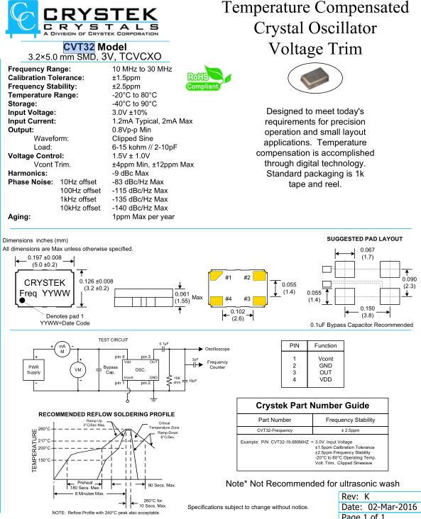 Crystek晶振,CVT32晶振,CVT32-19.680MHZ晶振,5032mm體積的石英晶體振蕩器,有源晶振,該產品可驅動2.5V的溫補晶振,壓控晶振,VC-TCXO晶體振蕩器產品,電源電壓的低電耗型,編帶包裝方式,可對應自動高速貼片機自動焊接,及IR回流焊接(無鉛對應),為無鉛產品,超小型,質地輕.產品被廣泛應用到集成電路,程控交換系統,無線發射基站.