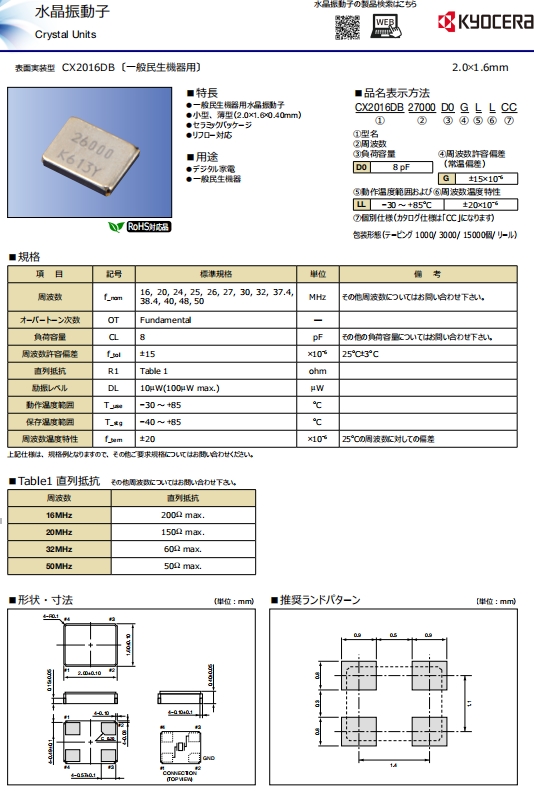 | CX2016DB32000D0GPSC1 | Kyocera水晶振動子 | CX2016DB, Kyocera | MHz Crystal | 32MHz | -40°C ~ 85°C |