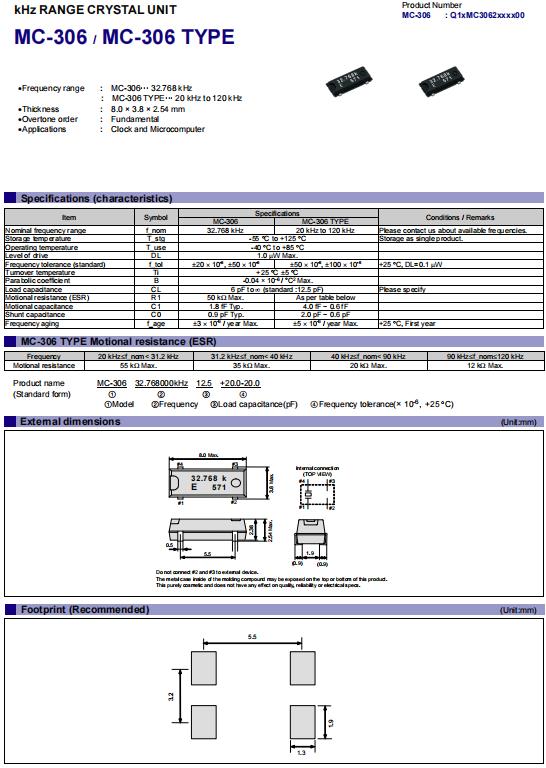 | Q13MC3061001800 | 8 x 3.8 x 2.54 mm | MC-306 | 32.768K晶振 | 12.5 pF | +/-10.0 ppm | -40 to +85 °C |