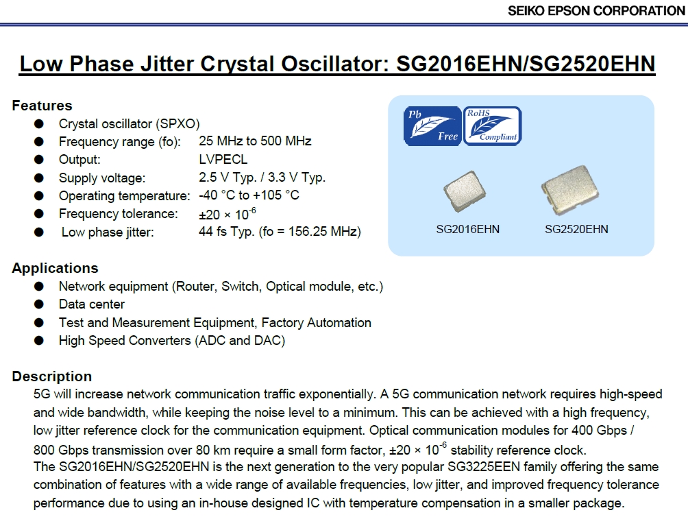 | X1G0059210001 | 愛普生晶振 | SG2520EHN | 156.250000 MHz | 2.50 x 2.00 x 0.84 mm | LV-PECL | 3.135 to 3.465 V | -40 to 85 °C |