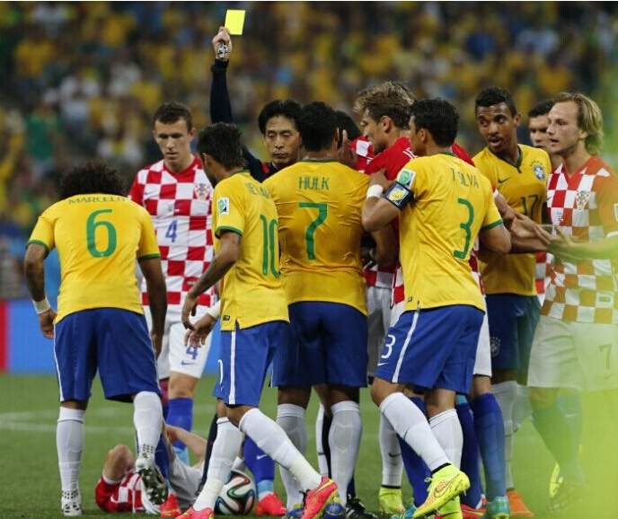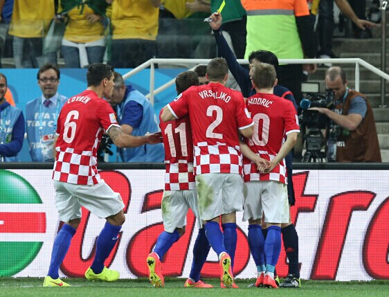 下半場,克羅地亞防守隊員在禁區內拉到了巴西隊員弗雷德,裁判的直接判罰點球讓本來就對裁判此前的判罰有頗多意見的克羅地亞人更加憤怒,直接把裁判圍了起來。可是再怎么爭論也沒用,又是內馬爾,主罰點球一蹴而就。雖然克羅地亞門將撲到了皮球,但皮球還是速度太快,飛進了網窩。