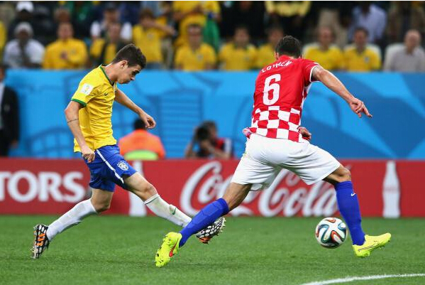 補時階段,巴西球星奧斯卡帶球長途奔襲,克羅地亞兩名隊員夾防,本以為這球再不分給左側隊友就沒了,可不想奧斯卡輕巧腳尖一捅直線射門,讓克羅地亞門將措手不及,巴西人第三次攻破對手球門。3:1的比分就此定格。