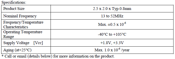 要解決這些問題,只有新尺寸的2.5 x 2.0mm,改進的最高工作溫度的+ 105°C(+ 85°C)與傳統高精度的溫度特性±0.5×10-6維護.單位也符合美國汽車工業的AEC-Q200標準.這些增強屬性,TCXO可以比以往任何時候都更加嚴厲的溫度環境中使用更高的自由的安裝.