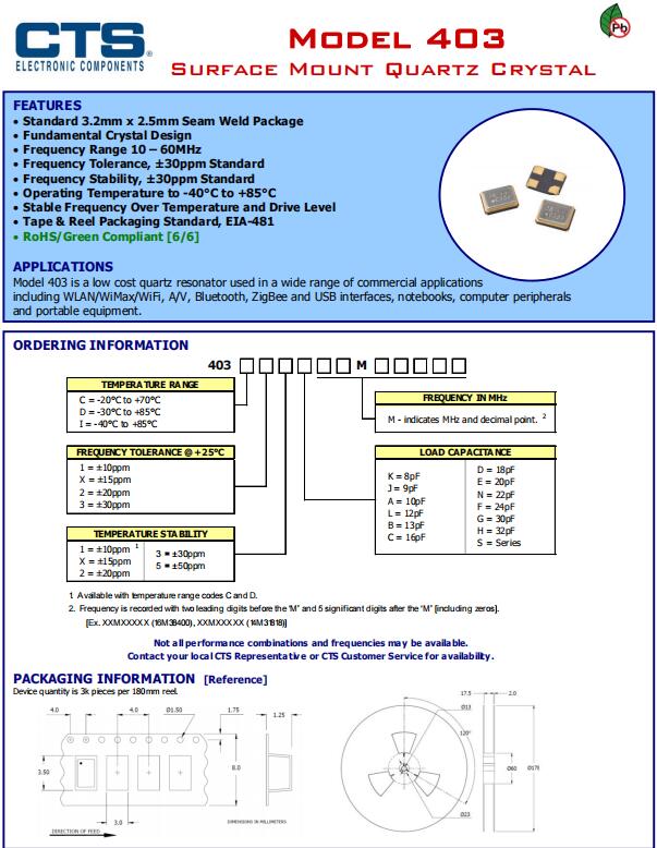 | 403CXXK32M00000 | CTS 晶振 | 403 | 32MHz | ±15ppm | ±15ppm | 8pF |