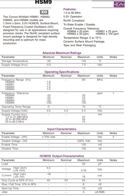 | HSM93-050.0M | Connor-Winfield振蕩器 | HSM9 | 50MHz | 0°C ~ 70°C |