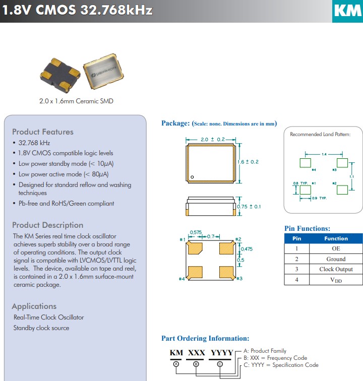 亞陶晶振KM系列1.8V,KM3270002,實時時鐘晶體振蕩器在廣泛的工作條件下實現了卓越的穩定性,頻率32.768kHz,CMOS晶體振蕩器,輸出時鐘信號與 LVCMOS/LVTTL邏輯電平兼容,四腳貼片晶振,該器件采用卷帶包裝,小體積晶振尺寸采用2.0x1.6mm表面貼裝陶瓷封裝。