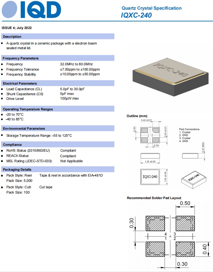 IQD晶振公司提供頻率產品是世界上最小的石英晶體IQXC-240,小體積尺寸僅為1.2x1.0mm毫米,石英晶體諧振器,高度僅為0.33毫米。IQXC-240的頻率范圍為36MHz至80MHz,非常適合物聯網、VGA、USB和Wi-Fi等空間寶貴的應用。在-20至70°C的商用溫度范圍內,SMD晶振 頻率穩定性可低至10ppm,在-40至85°C的工業溫度范圍內,頻率穩定性可低至15ppm,頻率容差可低至7ppm。符合最新一代微處理器的要求,負載電容可低至5pF。封裝在帶有電子束密封金屬蓋的4焊盤陶瓷密封封裝中,有助于將EMI輻射降至最低。根據IEC 60068-2-27標準,該產品能夠承受高達1000G的沖擊。根據EIA-481D,IQXC-240可提供磁帶和卷軸。石英晶體IQXC-240有助于將EMI輻射降至最低