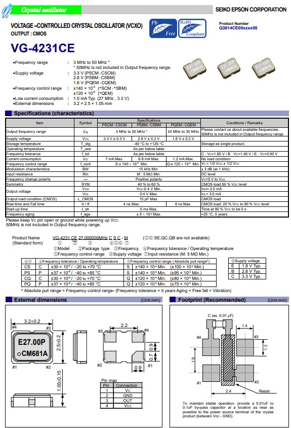 VG-4231CE電壓控制晶體振蕩器具有低電源電壓特性,Q3614CE00002300,CMOS輸出晶振