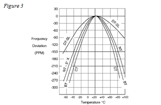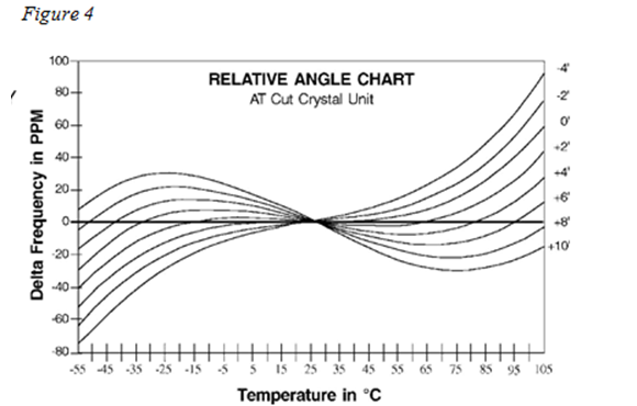 在各種元件中,石英晶振“AT”切割變得最受歡迎,因?yàn)樗谙鄬?duì)較高的頻率下可用,表現(xiàn)出出色的頻率與溫度穩(wěn)定性,并且以合理的成本廣泛可用.“AT”切割晶體單元的頻率與溫度能力如圖4所示.