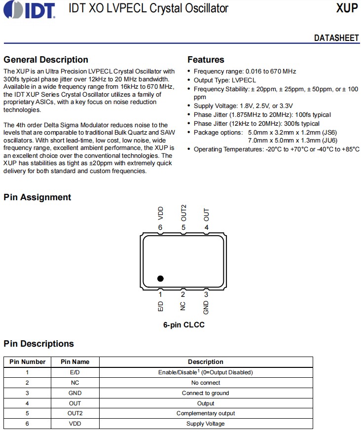 | XUP736100.000JU6I | IDT晶振 | LVPECL | 3.3V | OSC XO 100.0000MHZ SMD |