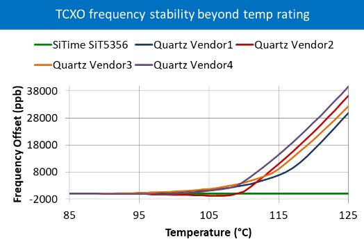 為此,我們推動(dòng)了各種有源晶振的極限,測(cè)量超出額定工作范圍的穩(wěn)定性.我們測(cè)試了額定溫度為+85°C的TCXO器件并將其推至+125°C,并測(cè)試了額定溫度為+85°C,最高溫度為+105°C的OCXO.以下圖表顯示了在這些較高溫度下性能下降的結(jié)果.在每次測(cè)試中,我們將MEMS振蕩器(用綠線表示)與來(lái)自不同供應(yīng)商的石英振蕩器進(jìn)行比較,所有這些都在同一類別中且具有相同的溫度額定值.為了使比較更容易,每個(gè)器件的值在+85°C時(shí)從它們的頻率開始,從同一點(diǎn)開始. 上圖顯示了五個(gè)工業(yè)級(jí)TCXO器件在+85°C至+125°C的頻率穩(wěn)定性