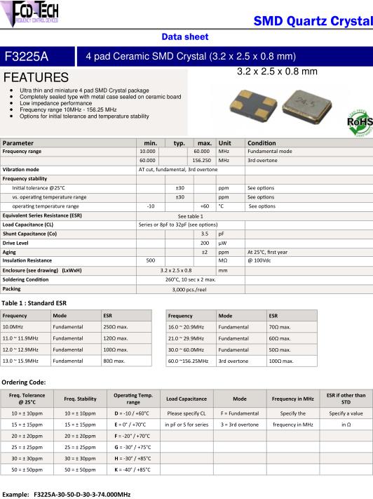 FCD-Tech晶振,F3225A晶振,F3225A-3050D303-24.000MHz晶振,超小型表面貼片型SMD晶振,最適合使用在汽車電子領域中,也是特別要求高可靠性的引擎控制用CPU的時鐘部分.低頻晶振可從7.98MHz起對應,小型,超薄型具備強防焊裂性,石英晶體在極端嚴酷的環境條件下也能發揮穩定的起振特性,產品本身具有耐熱,耐振,耐撞擊等優良的耐環境特性,滿足無鉛焊接以及高溫回流溫度曲線要求,符合AEC-Q200標準.
