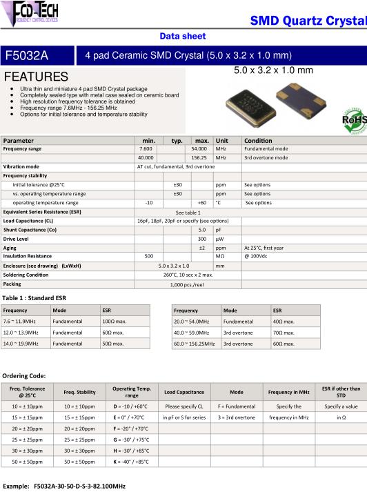 用于JEDEC J-STD-020D.01回流條件的耐熱可用性需個別判斷。請聯系我們以便獲取相關信息。FCD-Tech晶振,F5032B晶振,F5032B-3050DSF-12.000MHz晶振.