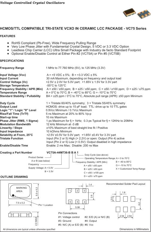 Fortiming晶振,VC75晶振,VC75A-24M736-BBA1晶振,壓控晶振(VCXO),壓控石英晶體振蕩器基本解決方案,PECL輸出,輸出頻率60MHz到200MHz之間,出色的低相位噪聲和抖動,三態功能,應用:SDH/SONET,以太網,基站,筆記本晶振應用,符合RoHS/無鉛.Fortiming晶振公司提供質量高的產品,工程支持和有競爭力的價格.我們的石英頻率控制器件系列包括晶體,晶體時鐘振蕩器,溫補晶振,OCXO,VCXO和晶體濾波器,這些器件采用多種引線和SMD晶振設計.我們致力于為您提供最好的服務,這是我們知道的最佳方式,可以贏得您的信任并建立持久的關系.