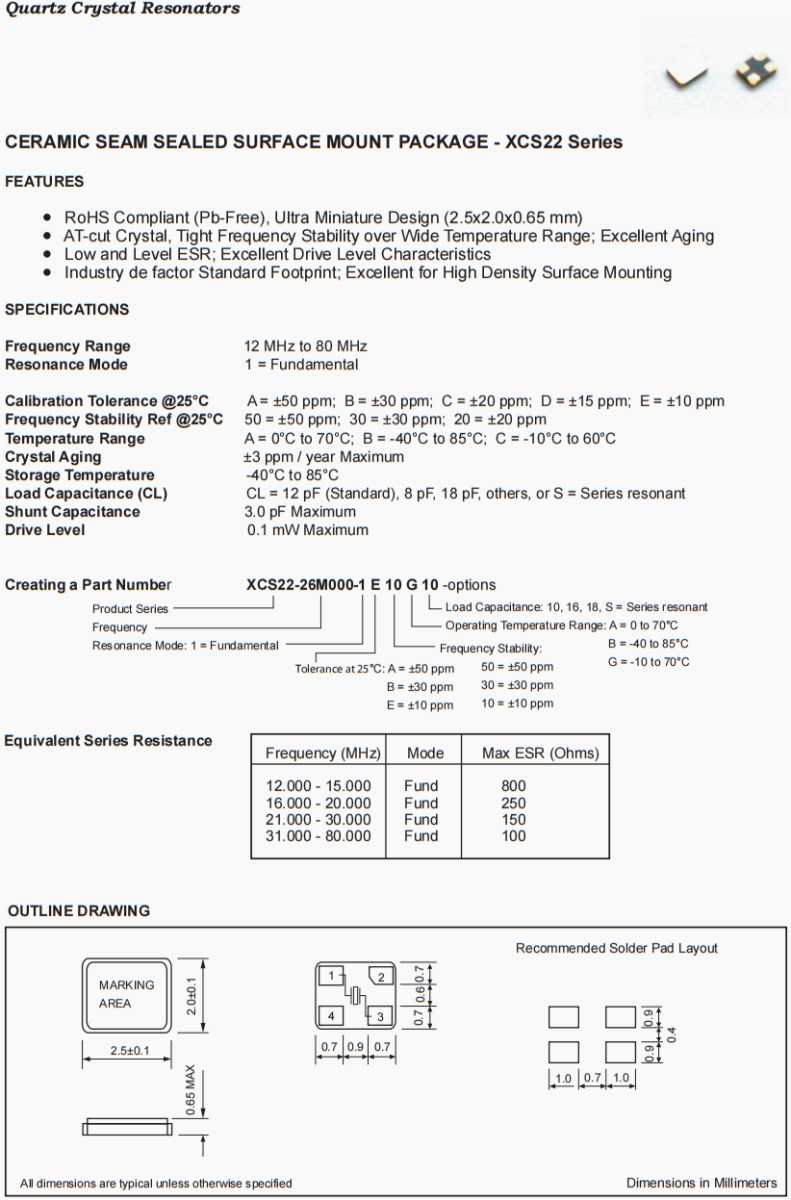 高品質富通晶振,智能輔助駕駛晶振,XCS22-12M288-1E20G10晶振,美國Fortiming晶振公司,歐美晶振,富通晶振,石英晶振,貼片晶振,小體積晶振,高品質晶振,低損耗晶振,耐高溫晶振,進口晶振,無源晶振,四腳晶振,汽車晶振,多功能方向盤晶振,無人機晶振,6G通訊設備晶振,陶瓷SEAM密封表面安裝包- XCS22系列具有RoHS兼容(無鉛),超微型設計(2.5x2.0x0.65 mm)切割晶體,在寬溫度范圍內的頻率穩定性;優良的低老化水平和水平ESR;優秀的驅動水平特性行業因素標準足跡;適用于高密度表面安裝