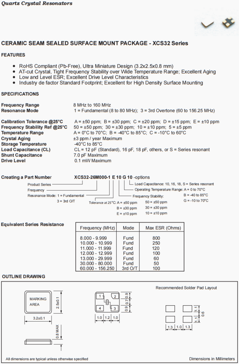 | 共振模式 | 1 = Fundamental (8 to 80 MHz); 3 = 3rd Overtone (60 to 156.25 MHz) |