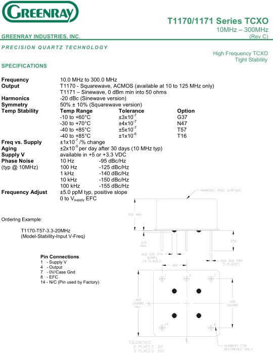 Greenray晶振,T1170晶振,T1170-T57-3.3-20MHz晶振