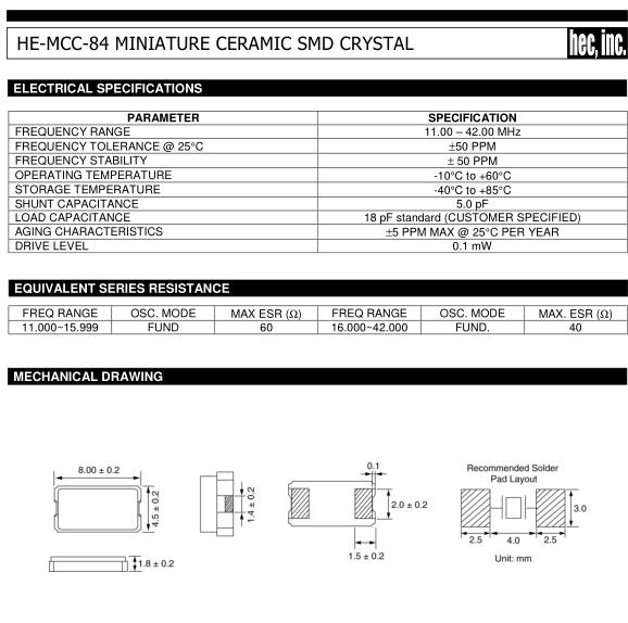 HEC晶振,HE-MCC-84晶振,HE-MCC-84-24.00-10晶振,貼片晶振本身體積小,超薄型石英晶體振蕩器,特別適用于有目前高速發(fā)展的高端電子數(shù)碼產(chǎn)品,因為晶振本身小型化需求的市場領(lǐng)域,小型,薄型是對應(yīng)陶瓷振蕩器(偏差大)和普通的石英晶體振蕩器(偏差小)的中間領(lǐng)域的一種性價比較出色的產(chǎn)品.產(chǎn)品廣泛用于筆記本電腦,無線電話,衛(wèi)星導(dǎo)航SSD,USB,Blu-ray等用途,符合無鉛焊接的高溫回流焊曲線特性.
