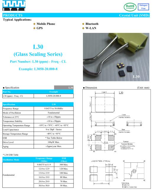 ITTI晶振,L30晶振,L3050-20.000-8晶振,超小型表面貼片型SMD晶振,最適合使用在汽車電子領域中,也是特別要求高可靠性的引擎控制用CPU的時鐘部分.低頻晶振可從7.98MHz起對應,小型,超薄型具備強防焊裂性,石英晶體在極端嚴酷的環境條件下也能發揮穩定的起振特性,產品本身具有耐熱,耐振,耐撞擊等優良的耐環境特性,滿足無鉛焊接以及高溫回流溫度曲線要求,符合AEC-Q200標準.