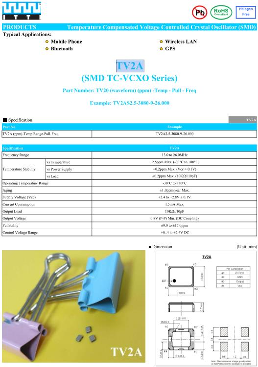 ITTI晶振,TV2A晶振,TV2AS2.5-3080-9-26.000晶振,壓控晶振(VCXO),壓控石英晶體振蕩器基本解決方案,PECL輸出,輸出頻率60MHz到200MHz之間,出色的低相位噪聲和抖動,三態功能,應用:SDH/SONET,以太網,基站,筆記本晶振應用,符合RoHS/無鉛.