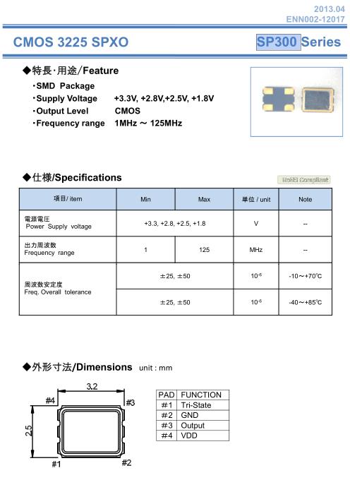 NAKA晶振,SP300晶振,SPXO晶振,小型SMD有源晶振,從最初超大體積到現(xiàn)在的7050mm,6035mm,5032mm,3225mm,2520mm體積,有著翻天覆地的改變,體積的變小也使產(chǎn)品帶來(lái)了更高的穩(wěn)定性能,接縫密封石英晶體振蕩器,精度高,覆蓋頻率范圍寬的特點(diǎn),SMD高速自動(dòng)安裝和高溫回流焊設(shè)計(jì),Optionable待機(jī)輸出三態(tài)輸出功能,電源電壓范圍:1.8V~5V,高穩(wěn)定性,低抖動(dòng),低功耗,主要應(yīng)用領(lǐng)域:無(wú)線通訊,高端智能手機(jī),平板筆記本W(wǎng)LAN,藍(lán)牙,數(shù)碼相機(jī),DSL和其他IT產(chǎn)品的晶振應(yīng)用,三態(tài)功能,PC和LCDM等高端數(shù)碼領(lǐng)域,符合RoHS/無(wú)鉛.