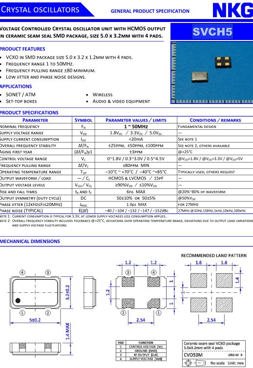 NJR晶振,SVCH5晶振,SVCH533B-26.000MT50A-EXT晶振,5032mm體積的石英晶體振蕩器,有源晶振,該產品可驅動2.5V的溫補晶振,壓控晶振,VC-TCXO晶體振蕩器產品,電源電壓的低電耗型,編帶包裝方式,可對應自動高速貼片機自動焊接,及IR回流焊接(無鉛對應),為無鉛產品,超小型,質地輕.產品被廣泛應用到集成電路,程控交換系統,無線發射基站.