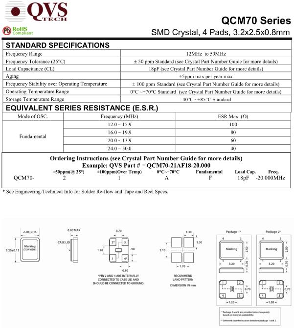 QVS晶振,QCM70晶振,QCM70-21AF18-20.000晶振,貼片晶振本身體積小,超薄型石英晶體振蕩器,特別適用于有目前高速發展的高端電子數碼產品,因為晶振本身小型化需求的市場領域,小型,薄型是對應陶瓷振蕩器(偏差大)和普通的石英晶體振蕩器(偏差小)的中間領域的一種性價比較出色的產品.產品廣泛用于筆記本電腦,無線電話,衛星導航SSD,USB,Blu-ray等用途,符合無鉛焊接的高溫回流焊曲線特性.QVS TECH INC已成功提供高品質的頻率控制產品超過 15 年。作為位于加利福尼亞州卡爾斯巴德的女性擁有的小型企業總部,QVS TECH INC 以為我們的客戶提供優質服務和快速交貨而享有盛譽。