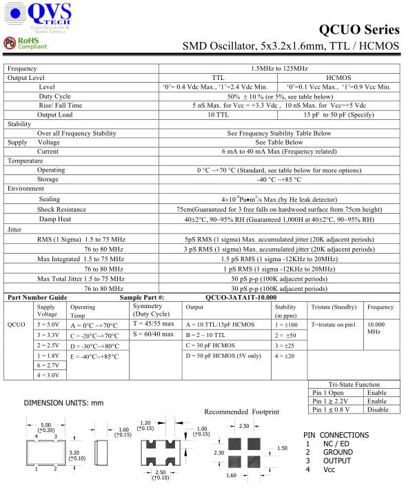 QVS晶振,QCUO晶振,QCUO-3ATA1T-10.000晶振,小型SMD有源晶振,從最初超大體積到現在的7050mm,6035mm,5032mm,3225mm,2520mm體積,有著翻天覆地的改變,體積的變小也使產品帶來了更高的穩定性能,接縫密封石英晶體振蕩器,精度高,覆蓋頻率范圍寬的特點,SMD高速自動安裝和高溫回流焊設計,Optionable待機輸出三態輸出功能,電源電壓范圍:1.8V~5V,高穩定性,低抖動,低功耗,主要應用領域:無線通訊,高端智能手機,平板筆記本WLAN,藍牙,數碼相機,DSL和其他IT產品的晶振應用,三態功能,PC和LCDM等高端數碼領域,符合RoHS/無鉛.正如我們的名字所暗示的那樣,我們的“質量、價值和服務”核心原則將不斷引領我們走向更高的卓越水平。通過結合一流的制造設施、專門從事晶體和振蕩器領域的管理專業知識、非常廣泛的產品線以及卓越的服務和支持水平,QVS TECH 正在發展成為頻率控制行業的領導者。