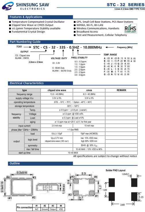 SHINSUNG晶振,STC-32晶振,STC-CS-32-33S-0.5HZ-10.000MHz晶振,溫補晶振(TCXO)產品本身具有溫度補償作用,高低溫度穩定性:頻率精度高0.5PPM-2.0PPM,工作溫度范圍:-30度至85度,電源電壓:1.8V-3.3V之間可供選擇,產品本身具有溫度電壓控制功能,世界上最薄的晶振封裝,頻率:26兆赫,33.6兆赫,38.4兆赫,40兆赫,因產品性能穩定,精度高等優勢,被廣泛應用到一些比較高端的數碼通訊產品領域,GPS全球定位系統,智能手機,WiMAX和蜂窩和無線通信等產品,符合RoHS/無鉛.SHINSUNG晶振公司的發展如下: