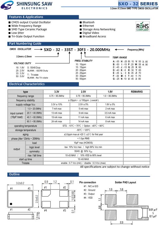 SHINSUNG晶振,SXO-32晶振,SXO-32-33ST-30F3-20.000MHz晶振,小型SMD有源晶振,從最初超大體積到現在的7050mm,6035mm,5032mm,3225mm,2520mm體積,有著翻天覆地的改變,體積的變小也使產品帶來了更高的穩定性能,接縫密封石英晶體振蕩器,精度高,覆蓋頻率范圍寬的特點,SMD高速自動安裝和高溫回流焊設計,Optionable待機輸出三態輸出功能,電源電壓范圍:1.8V?5V,高穩定性,低抖動,低功耗,主要應用領域:無線通訊,高端智能手機,平板筆記本WLAN,藍牙,數碼相機,DSL和其他IT產品的晶振應用,三態功能,PC和LCDM等高端數碼領域,符合RoHS/無鉛.
