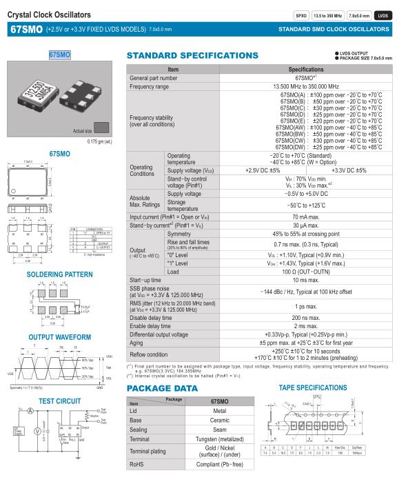 67SMO(A): ±100 ppm over -20゜C to +70゜C 67SMO(B): ±50 ppm over -20゜C to +70゜C 67SMO(C): ±30 ppm over -20゜C to +70゜C 67SMO(D): ±25 ppm over -20゜C to +70゜C 67SMO(E): ±20 ppm over -20゜C to +70゜C 67SMO(AW): ±100 ppm over -40゜C to +85゜C 67SMO(BW): ±50 ppm over -40゜C to +85゜C 67SMO(CW): ±30 ppm over -40゜C to +85゜C 67SMO(DW): ±25 ppm over -40゜C to +85゜C |