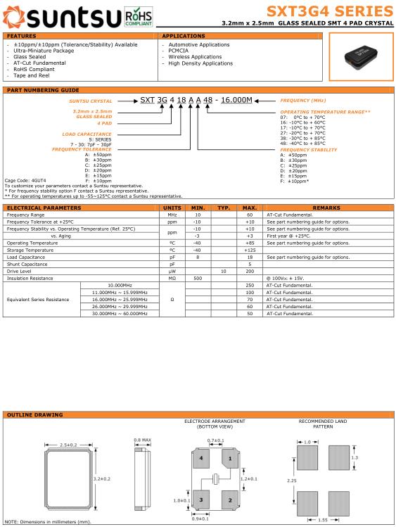 | Suntsu晶振規(guī)格 | 單位 | SXT3G4晶振頻率范圍 | 石英晶振基本條件 | |