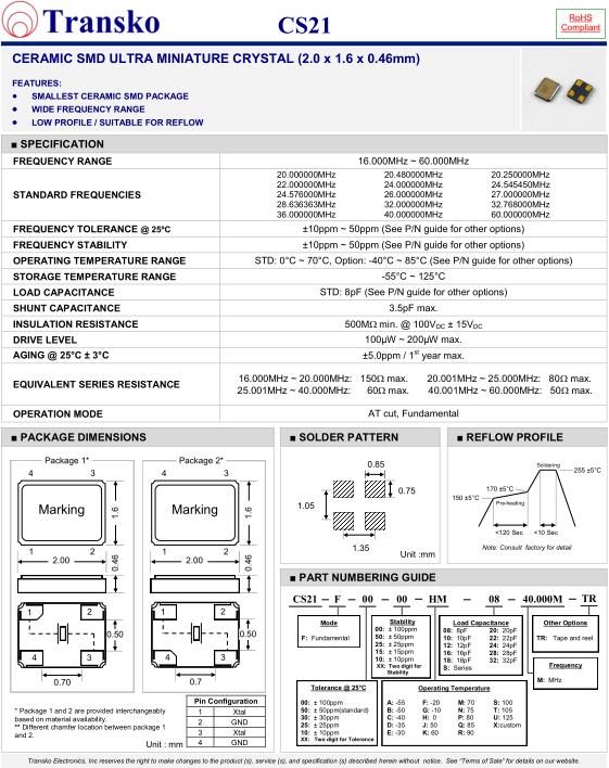 | SPECIFICATION-Transko晶振 | CS21晶振 |