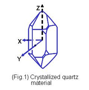 石英是由硅原子和氧原子組合而成的二氧化硅(Silicon Dioxide, SiO2), 以32點群的六方晶系形成的單結晶結構﹝圖一﹞.單結晶的石英晶體結構具有壓電效應特性, 當施加壓力在晶體某些方向時, 垂直施力的方向就會產生電氣電位. 相對的當以一個電場施加在石英晶體某些軸向時, 在另一些方向就會產生變形或振動現象. 掌握單結晶石英材料的這種壓電效應, 利用其發生共振頻率的特性, 發揮其精確程度作為各類型頻率信號的參考基準, 就是水晶震蕩器的設計與應用. 因為石英晶體具有很高的材料Q值,所以絕大部份的頻率控制組件,如共振子及振蕩器,都以石英材料為基礎. 以石英為基礎的頻率控制組件可以依其壓電振動的屬性, 可以分為體波(bulk wave)振動組件及表面聲波(surface acoustic wave)振動組件. 體波振動組件如石英晶體共振子, 石英晶體濾波器及石英晶體振蕩器, 表面波振動組件如表面波濾波器及表面波共振子. 當石英晶體以特定的切割方式, 以機械加工方式予以表面研磨, 完成特定的外型尺寸就是通稱的石英芯片(quartz wafer 或 quartz blank ). 將這個石英芯片放置在真空還境中, 于表面鍍上電極后,再以導電材料固定在金屬或是陶瓷基座上, 并加以封裝, 就成為一般所謂的石英晶體共振子( quartz crystal resonator ). 利用石英共振子在共振時的低阻抗特性及波的重迭特性, 用鄰近的雙電極, 可以做出石英晶體濾波器. 將石英振蕩子加上不同的電子振蕩線路, 可以做成不同特性的石英振蕩器. 例如: 石英頻率振蕩器(CXO), 電壓控制石英晶體振蕩器(Voltage Controlled Crystal Oscillator, VCXO), 溫度補償石英晶體振蕩器(Temperature Compensated Crystal Oscillator, TCXO), 恒溫槽控制石英晶體振蕩器(Oven Controlled Crystal Oscillator, OCXO)…等. 相對于體波諧振的是表面聲波的諧振. 將石英晶體表面鍍以叉狀電極(inter-digital-transducer, IDT)方式所產生的表面振蕩波, 可以制造出短波長(高頻率)諧振的表面聲波共振子(SAW Resonator)或表面聲波濾波器(SAW Filter).