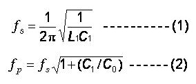 在評(píng)估共振時(shí)的等效線路時(shí), 串聯(lián)諧振頻率及并聯(lián)諧振頻率, fs and fp , 是最重要的二個(gè)頻率參數(shù). 對(duì)于串聯(lián)諧振頻率及并聯(lián)諧振頻率( fs and fp )二者的關(guān)系, 我們可以用下列公式來表達(dá):