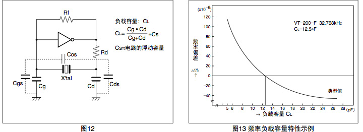 "Q-SPT2S0327620C5DJ",石英晶振的負載容量 (CL) 是用來決定在振蕩電路中晶振頻率的參數,從加在振蕩電路中晶振兩端的電容可知負載容量(參閱圖12). 因振蕩電路的負載容量的不同,晶振的頻率會相應地產生變動.為了獲得目標的頻率精度,必須使晶振與負載容量相匹 配.在使用時,請根據相應晶振的負載容量,將振蕩電路的負載容量設定為與其相符.