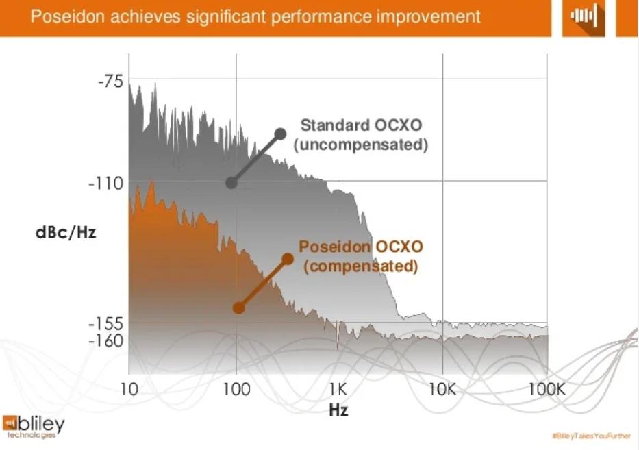 低相位噪聲振蕩器小于250 fs-RMS在高性能應用中至關重要。這是因為高相位噪聲水平可能導致高誤碼率(BER)甚至系統通信完全丟失。因此,從低相位噪聲時鐘源開始總是更安全,尤其是在高端應用中。如下圖所示,補償振蕩器可以顯著降低高振動環境中的相位噪聲。