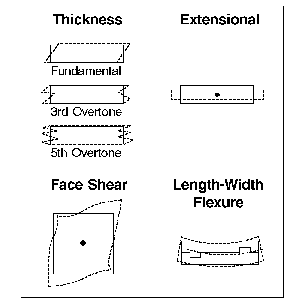 厚度剪切;切割:AT, BT, SC;頻率:1 - 30mhz(基頻);30 - 90 MHz(三次諧波泛音模式);60 - 150 MHz(5次諧波泛音模式);等。