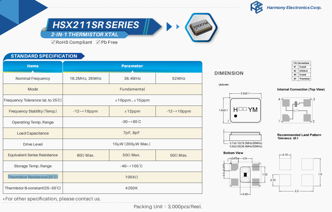 | X2C016000B81H-R | 加高晶振 | HSX211S | 16 MHz | ±10ppm | 8pF |